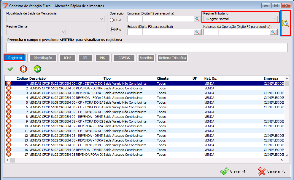 • Para começar, selecione o regime tributário e faça a pesquisa. Em seguida, marque todas as variações fiscais que você deseja alterar em massa.