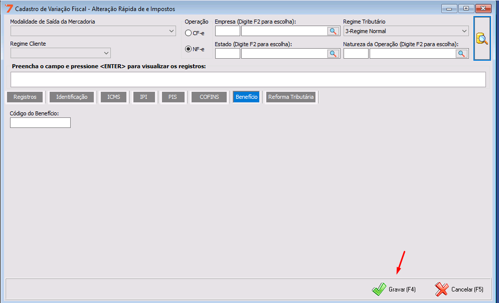 Use esta opção se o benefício fiscal for aplicado a um grupo de produtos ou a um tipo de operação (por exemplo, todas as vendas com um CFOP específico).